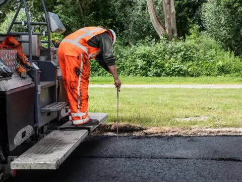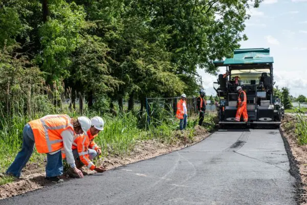 In De Nieuwe Straat testen we laagtemperatuurasfalt, synthetische bindmiddelen en gerecyclede materialen om emissies en de impact op het milieu te verminderen – zoals hier in het Nelson Mandelapark.