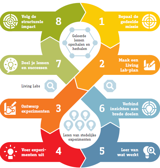 Om het werken in Living Labs makkelijker te maken vertalen we het proces op duidelijke stappen, hulpmiddelen en werkvormen. Dat helpt om doelen, rollen en verwachtingen goed op elkaar af te stemmen. Het is geen handleiding die voor elke situatie hetzelfde voorschrijft. Het is een gedeelde werkwijze waarmee je samen met andere partijen samen duurzame oplossingen kunt ontwikkelen.